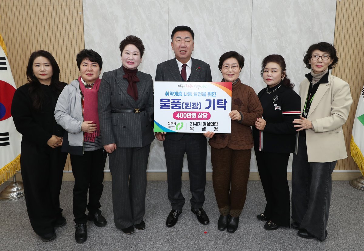 임시청사 직지실에서 진행된 기탁식에는 이범석 청주시장과 유현순 21세기여성연합 청주시지부 회장, 전순자 옥샘정 대표가 참석했다.