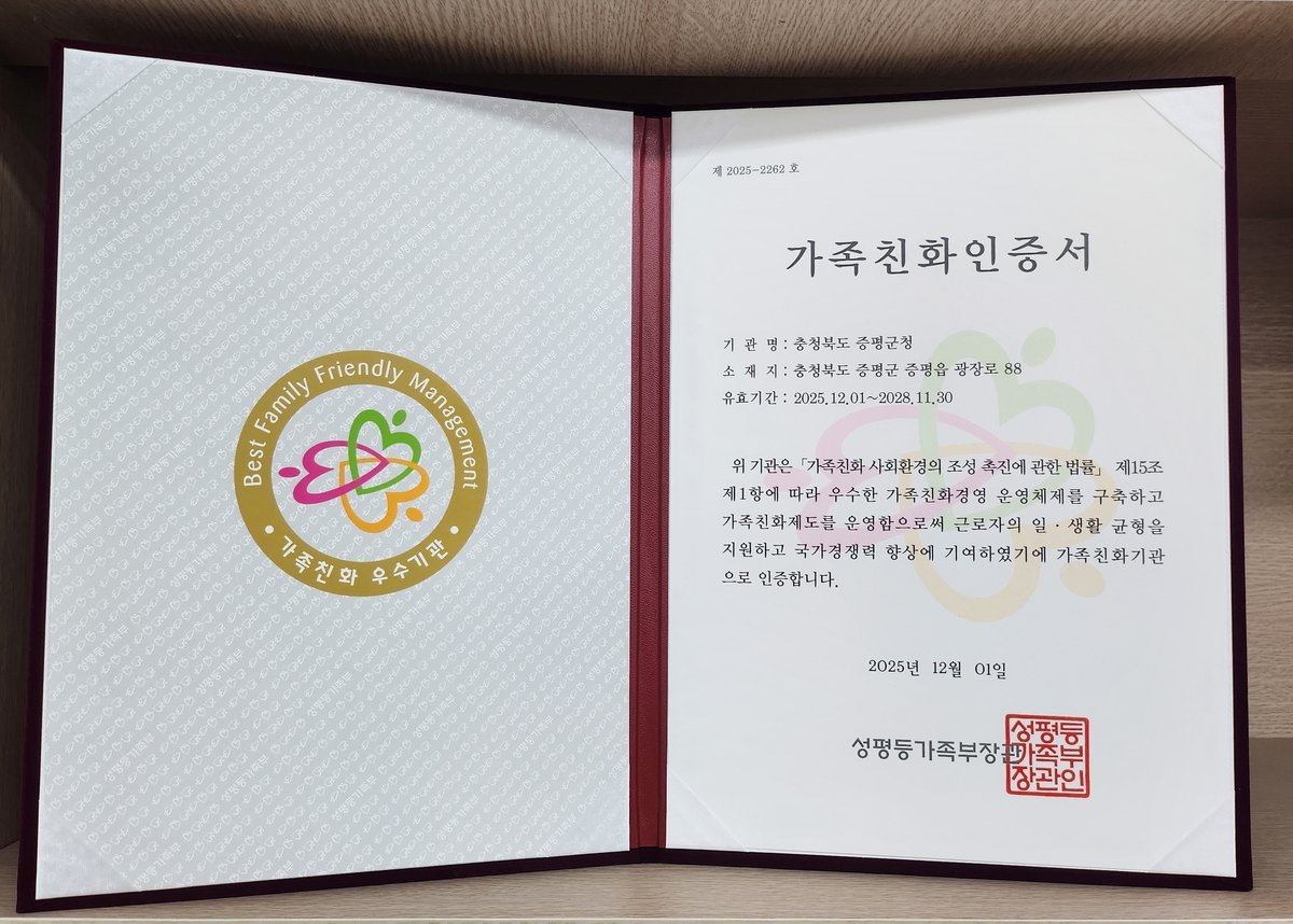 [충청뉴스큐] 충북 증평군은 성평등가족부가 주관하는 가족친화 인증심사에서 ‘가족친화 인증기관’으로 5회 연속 선정됐다고 20일 밝혔다.