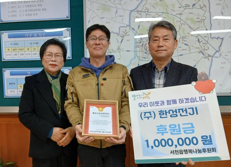 [충청뉴스큐] ㈜한성전기는 지난 19일 서천읍행복나눔후원회에 취약계층 지원을 위한 후원금 100만원을 기탁하며 ‘좋은이웃사촌 186호’로 선정됐다.