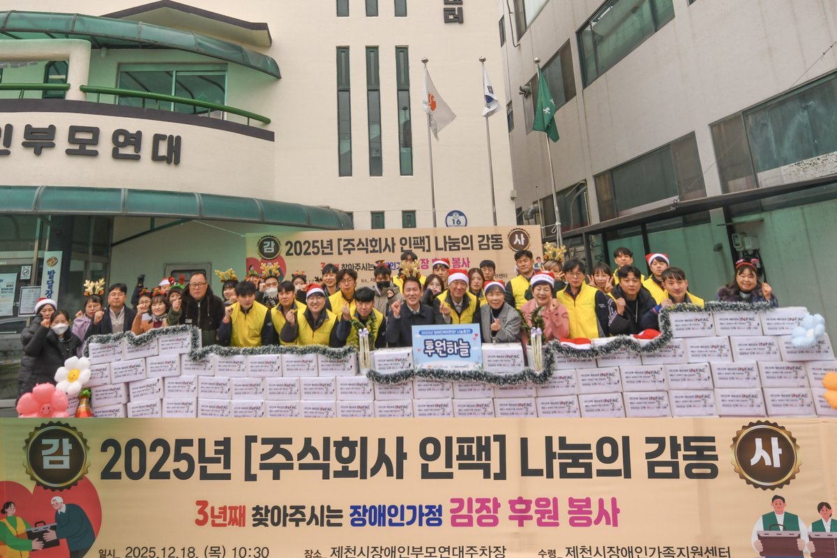 이번 후원을 통해 ㈜인팩은 김장김치 100박스를 기증했으며, 기탁된 김치는 제천시 장애인가정을 비롯해 가정폭력상담소, 성폭력상담소, 제천시장애인협회, 제천시농아인협회, 장애인보호작업장, 뇌병변장애인협회 소속 가정, 장애인한궁선수 가정 등 지역 내 다양한 복지 현장에 전달됐다.