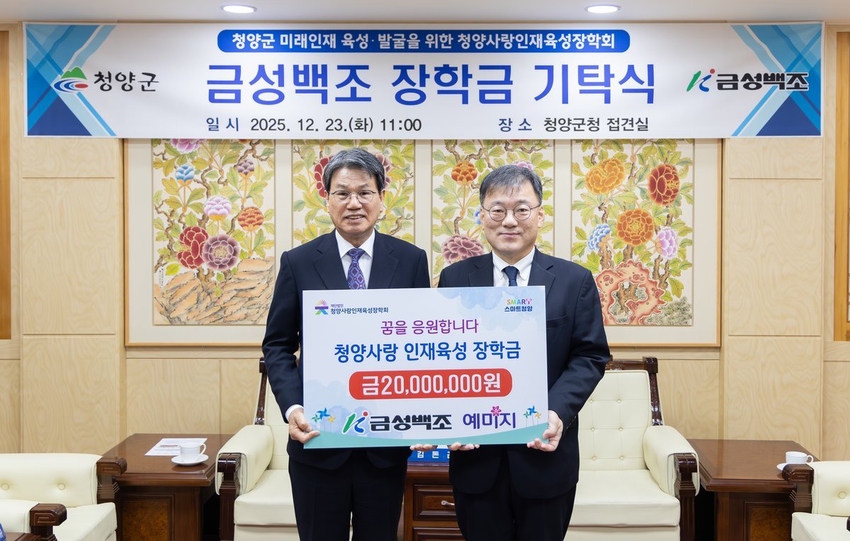 [충청뉴스큐] ㈜금성백조주택은 지난 23일 청양군청을 방문해 청양사랑인재육성장학회 김돈곤 이사장에게 지역 인재 육성을 위한 장학금 2천만 원을 기탁했다.