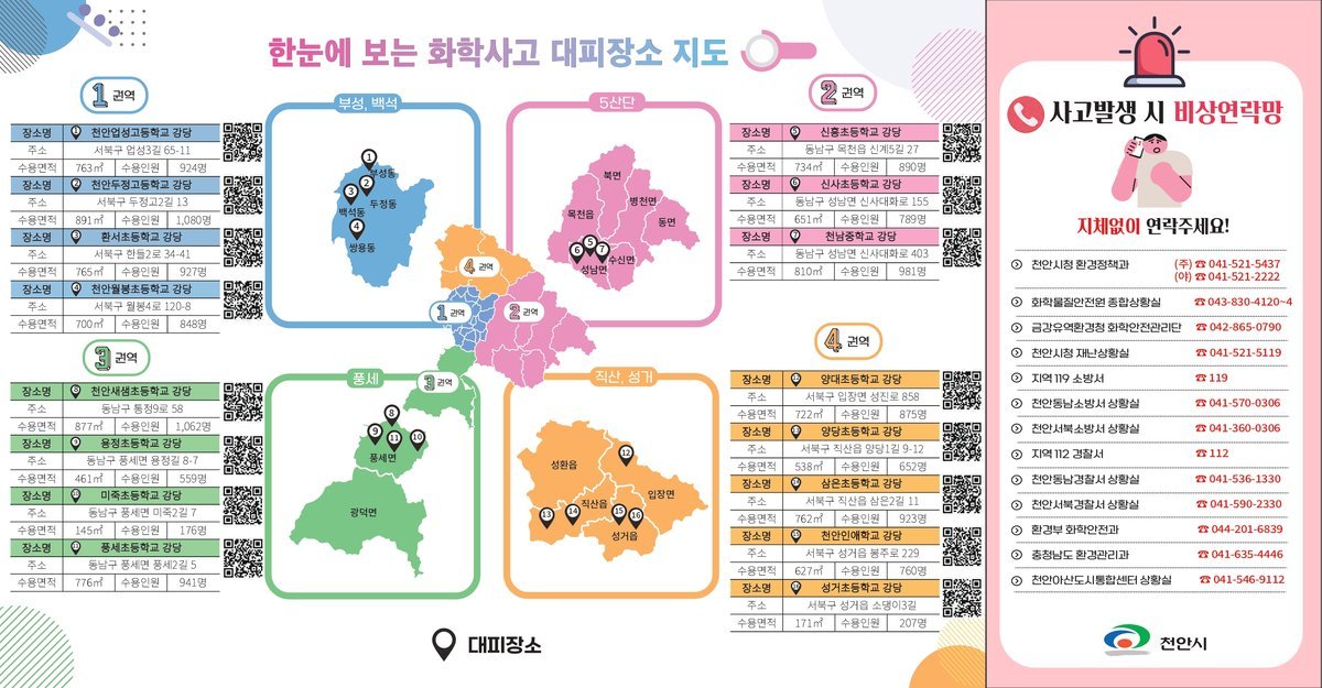 [충청뉴스큐] 천안시는 ‘화학사고 대피장소 안내지도’를 5개 국어 리플렛과 QR안내판, 포스터 등 다양한 형식으로 제작해 배포했다고 26일 밝혔다.