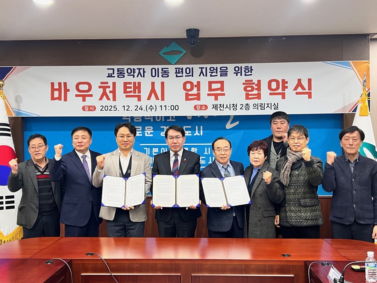 [충청뉴스큐] 제천시는 지난 24일 교통약자의 이동권 보장과 이동 편의 증진을 위해 청풍호콜센터, ㈜티머니 모빌리티와 바우처택시 업무협약을 체결했다.