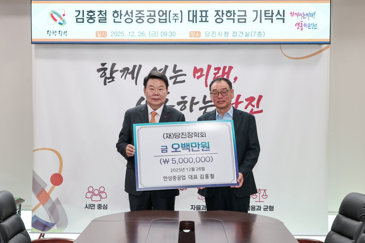 오성환 이사장은 “지역 학생들을 위해 꾸준히 장학금을 기탁해 주셔서 감사드린다”며 “기탁해 주신 장학금은 당진 학생들이 꿈을 포기하지 않고 학업에 전념할 수 있도록 소중히 사용하겠다”고 답했다.