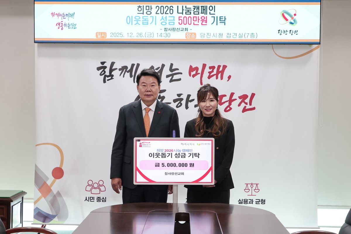 [충청뉴스큐] 당진 참사랑선교회가 26일 오후 당진시청을 방문해 ‘희망2026 나눔캠페인’이웃돕기 성금 500만 원을 기탁하며 지역사회에 따뜻한 온정을 전했다.