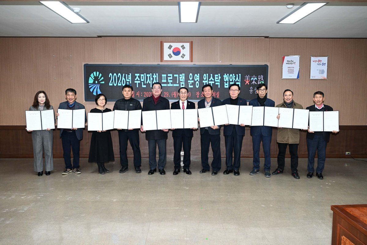 [충청뉴스큐] 홍성군은 지난 29일 군청 회의실에서 김노성 홍성군주민자치협의회장을 비롯한 11개 읍‧면 주민자치회장이 참석한 가운데 ‘2026년 주민자치센터 프로그램 운영 위‧수탁 협약식’을 개최했다.