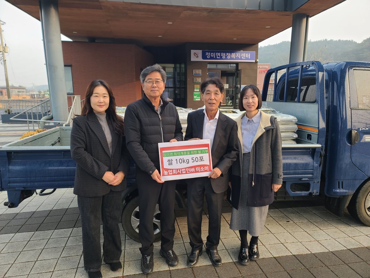 [충청뉴스큐] 정미면는 지난 29일 농업회사법인 미소미가 지역 내 취약계층을 위해 180만 원 상당의 햅쌀 50포를 기부하며 추운 연말연시에 따뜻한 이웃사랑을 전달했다고 30일 밝혔다.
