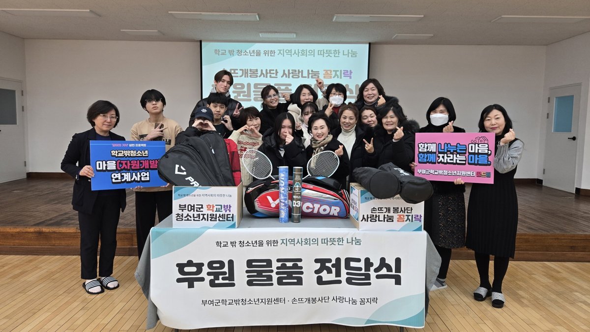 부여군학교밖청소년지원센터 관계자는 “지역사회의 따뜻한 나눔이 학교 밖 청소년의 일상과 성장으로 이어지고 있다.”라며, “앞으로도 지역사회 자원 연계를 통해 지속 가능한 협력 모델을 확대해 나가겠다.”라고 밝혔다.