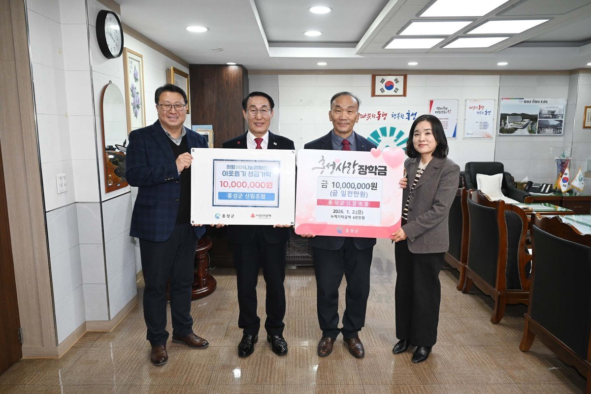 [충청뉴스큐] 홍성군은 지난 2일 홍성군 산림조합이 지역의 우수한 인재 육성과 어려운 이웃을 돕기 위한 따뜻한 마음을 담아 장학금과 이웃돕기 성금 각 1천만원씩, 총 2천만원을 홍성군에 기탁했다고 밝혔다.