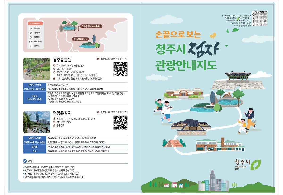 점자 관광안내 지도에는 청주의 핵심 관광지 15곳의 위치를 점자로 표기했으며, 열린관광지로 선정된 청주동물원과 명암유원지에 대한 정보도 함께 담았다.