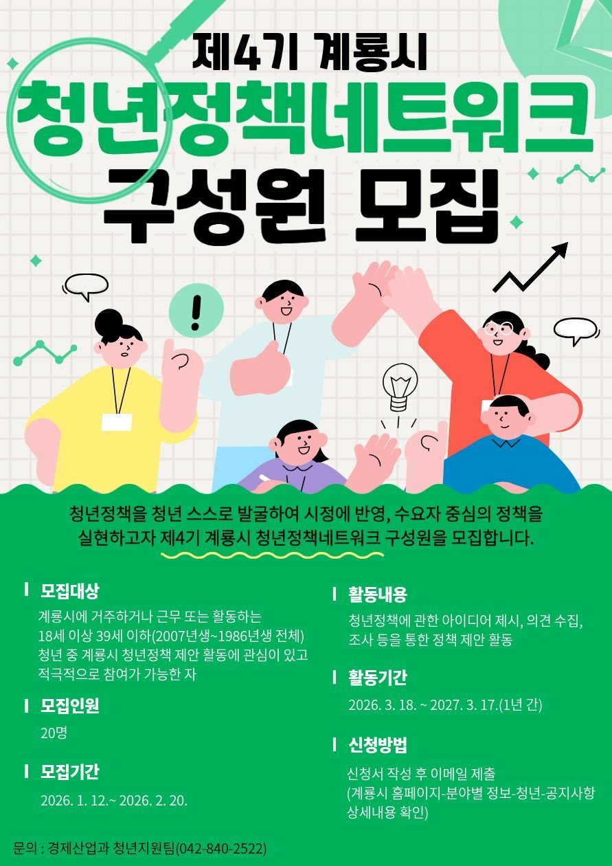 [충청뉴스큐] 충남 계룡시는 이달 12일부터 오는 2월 20일까지 제4기 청년정책네트워크에 참여할 지역 청년을 모집한다.