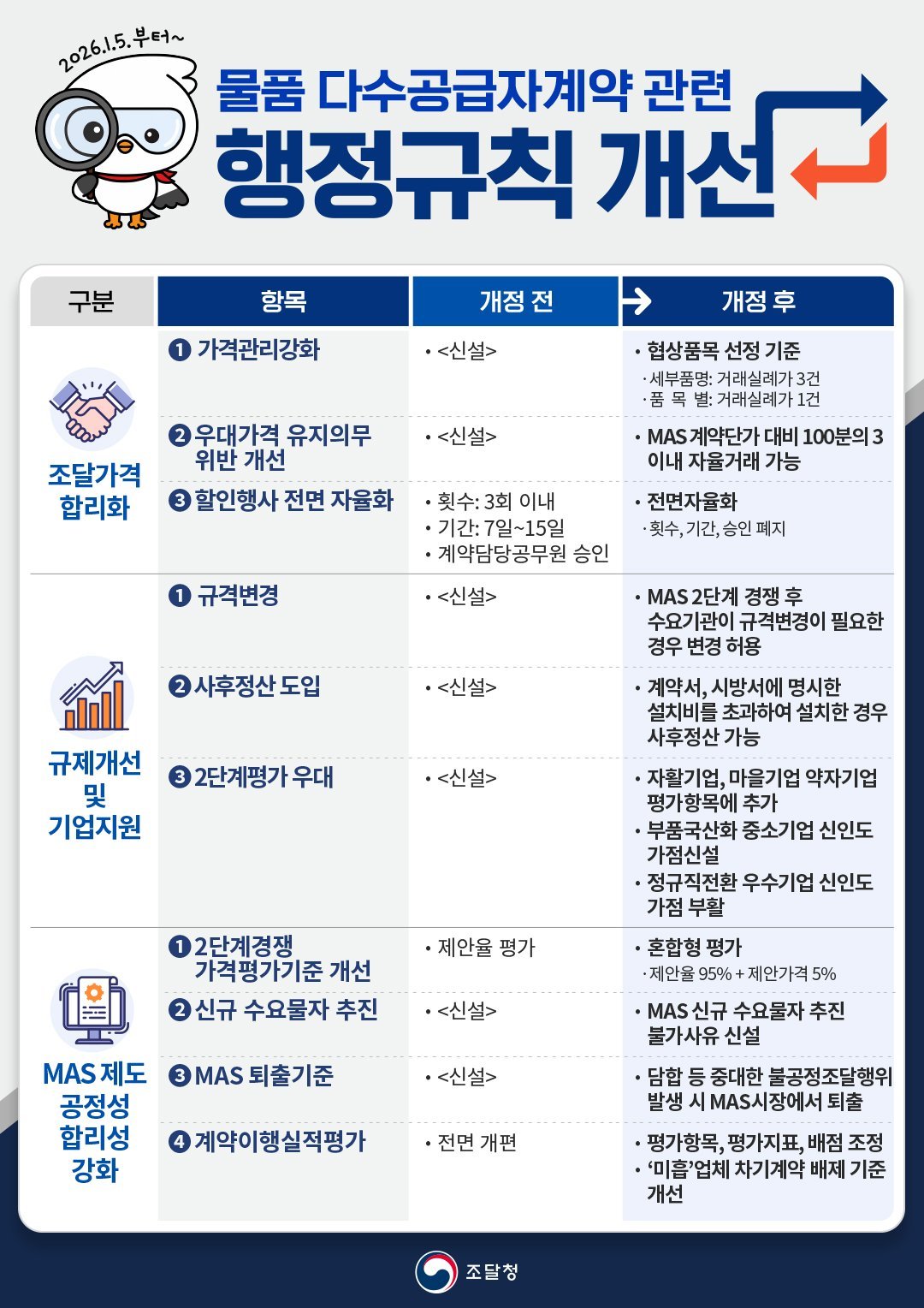 [충청뉴스큐] 조달청은 조달 가격의 신뢰성을 높이고, 공공조달에 남아 있는 불합리한 규제를 혁파하기 위해 「물품 다수공급자계약 관련 행정규칙 2종*」을 개정하여 2026년 1월 5일부터 시행했다고 밝혔다.