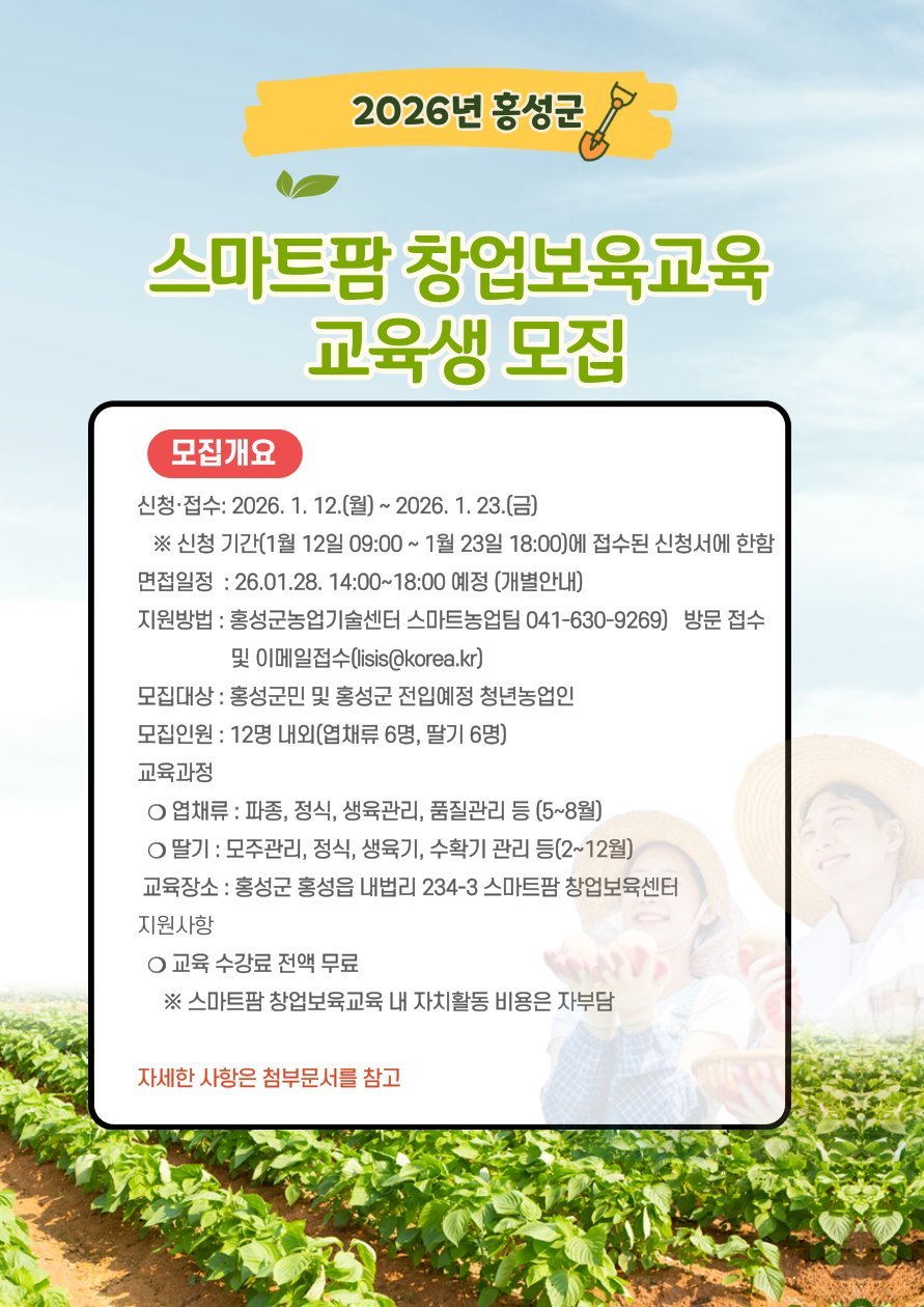 [충청뉴스큐] 홍성군에서는 스마트농업 창업과 확산을 위해 스마트팜 창업보육교육의 교육생을 오는 23일까지 모집한다.