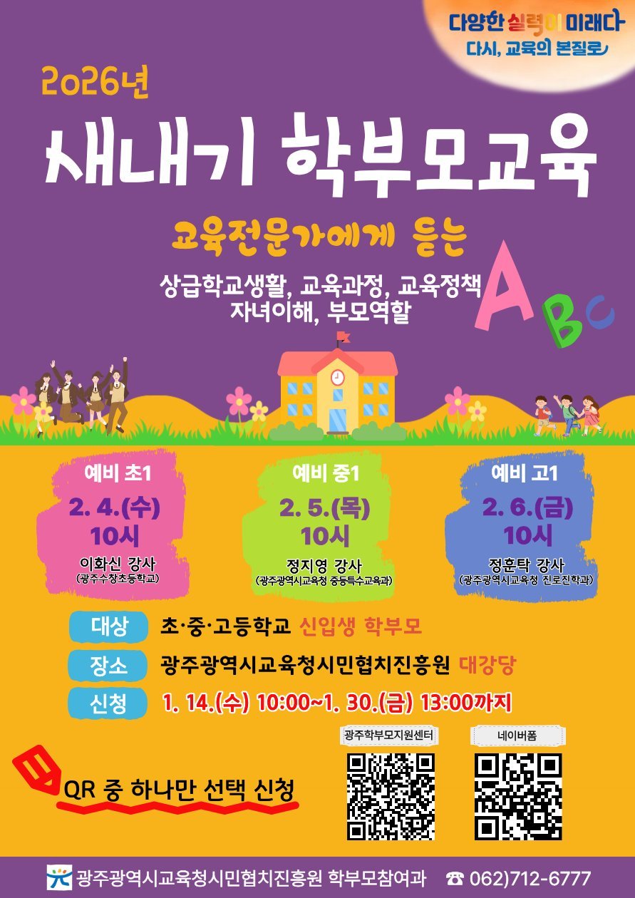 [충청뉴스큐] 광주시교육청시민협치진흥원은 오는 2월 4~6일 본원 대강당에서 초·중·고등학교 신입생 학부모를 대상으로 '2026년 새내기 학부모교육'을 운영한다.