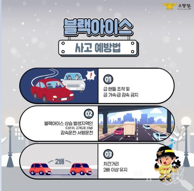 이에 예산소방서는 ▲급 핸들 조작 및 급 가속ˑ급 감속 금지 ▲블랙아이스 상습 발색지역인 다리위, 고가도로, 터널에서는 감속운전ˑ서행운전 ▲차간거리 2배 이상 유지 할 것을 당부했다.