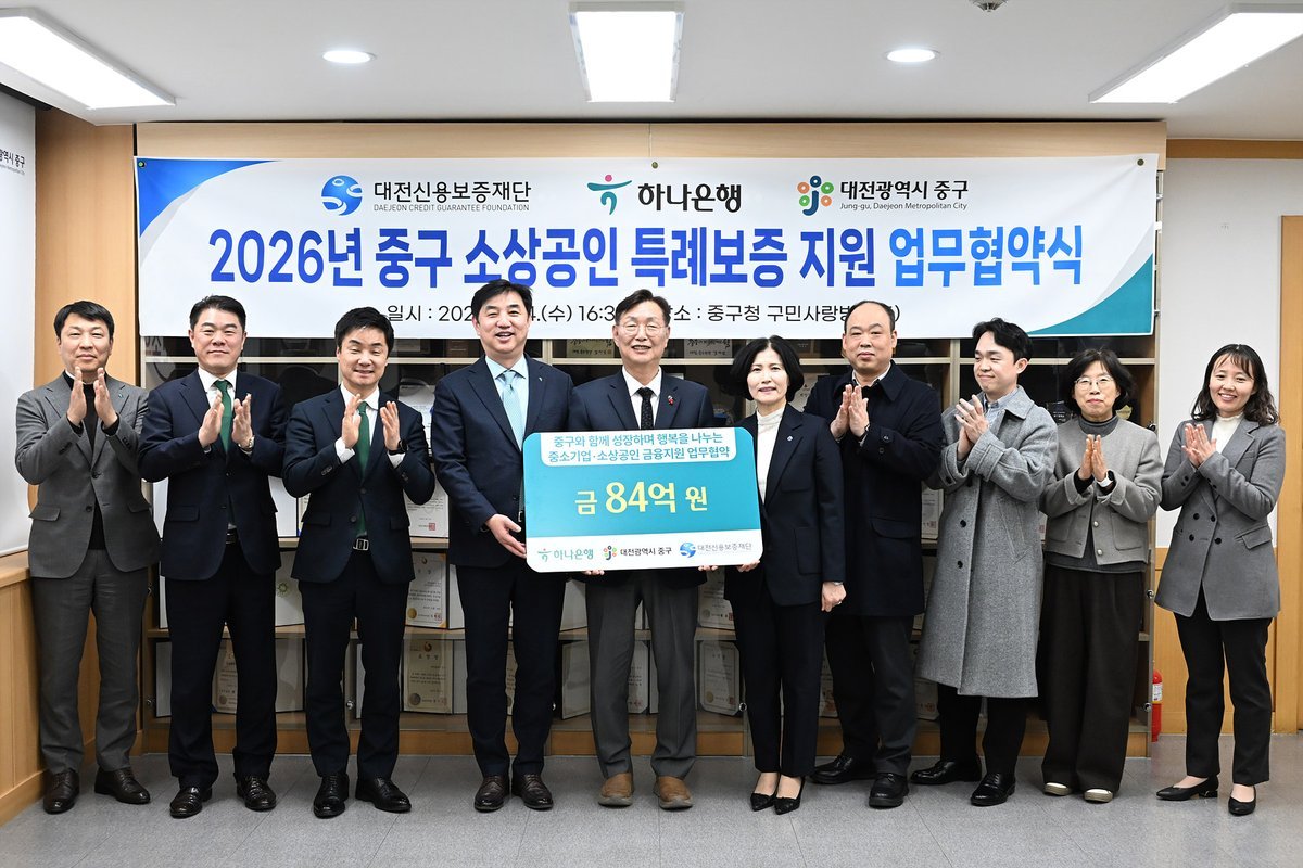[충청뉴스큐] 대전 중구는 지난 2024년과 2025년에 이어 올해에도 중구 관내 소상공인 경영안정자금 지원을 위해 대전신용보증재단, 하나은행과 협약을 맺고 총 84억 원 규모의 소상공인 특례 보증을 지원한다고 15일 밝혔다.