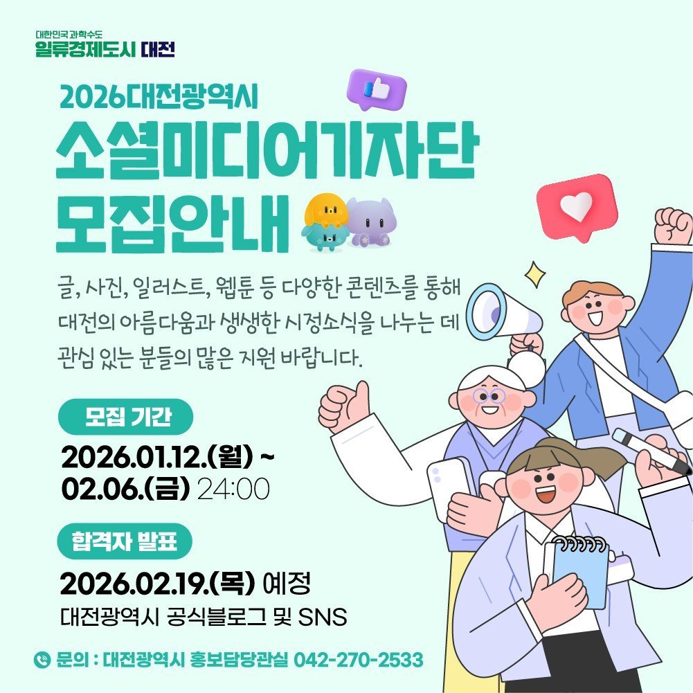 [충청뉴스큐] 대전시는 참신한 아이디어와 열정을 가지고 꿀잼도시 대전의 매력을 알릴‘2026 대전광역시 소셜미디어기자단’및‘2026 대전광역시 글로벌 서포터즈’를 모집한다.