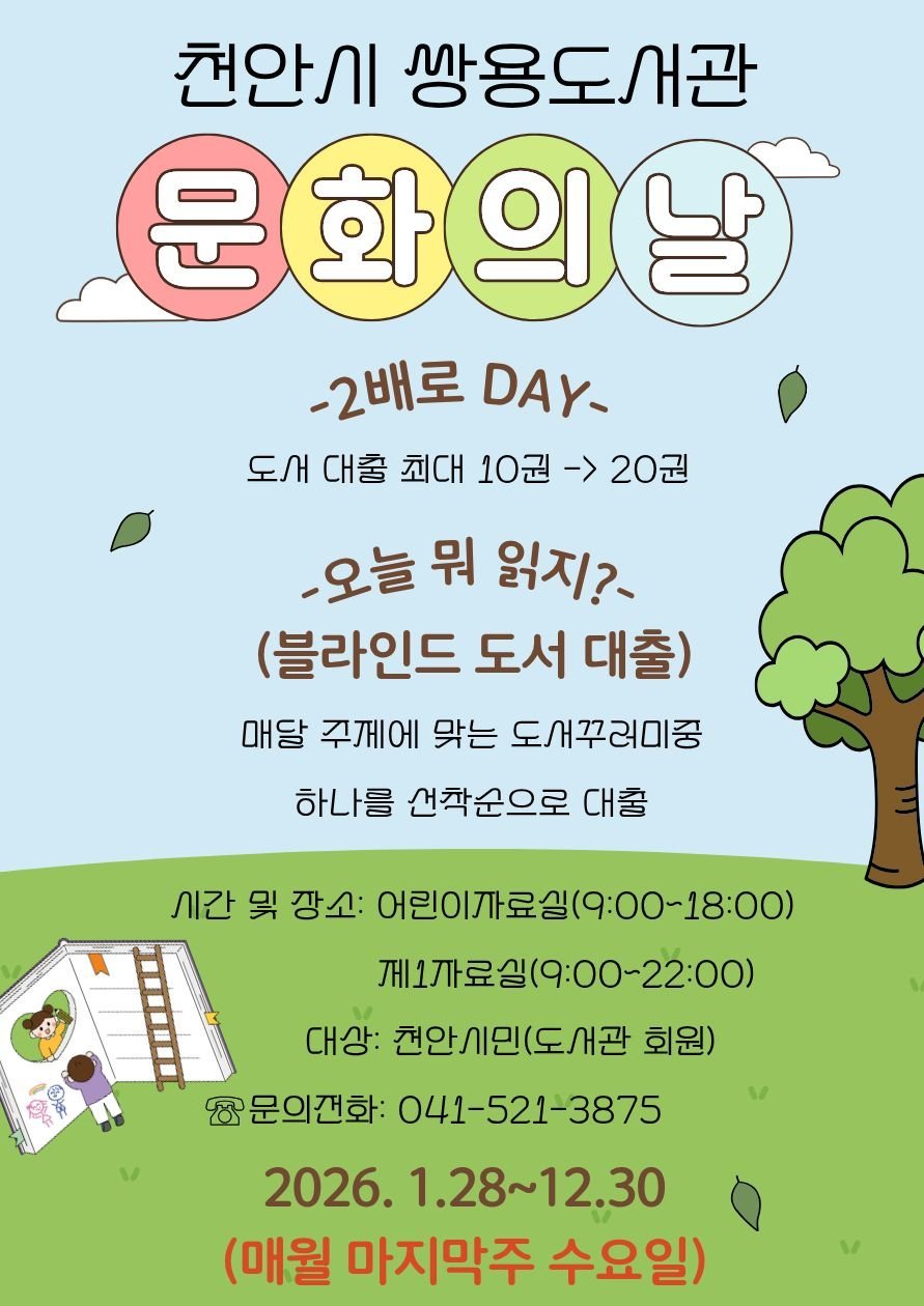 [충청뉴스큐] 천안시 쌍용도서관은 매달 마지막주 수요일 ‘2026 문화가 있는 날’행사를 운영한다고 16일 밝혔다.