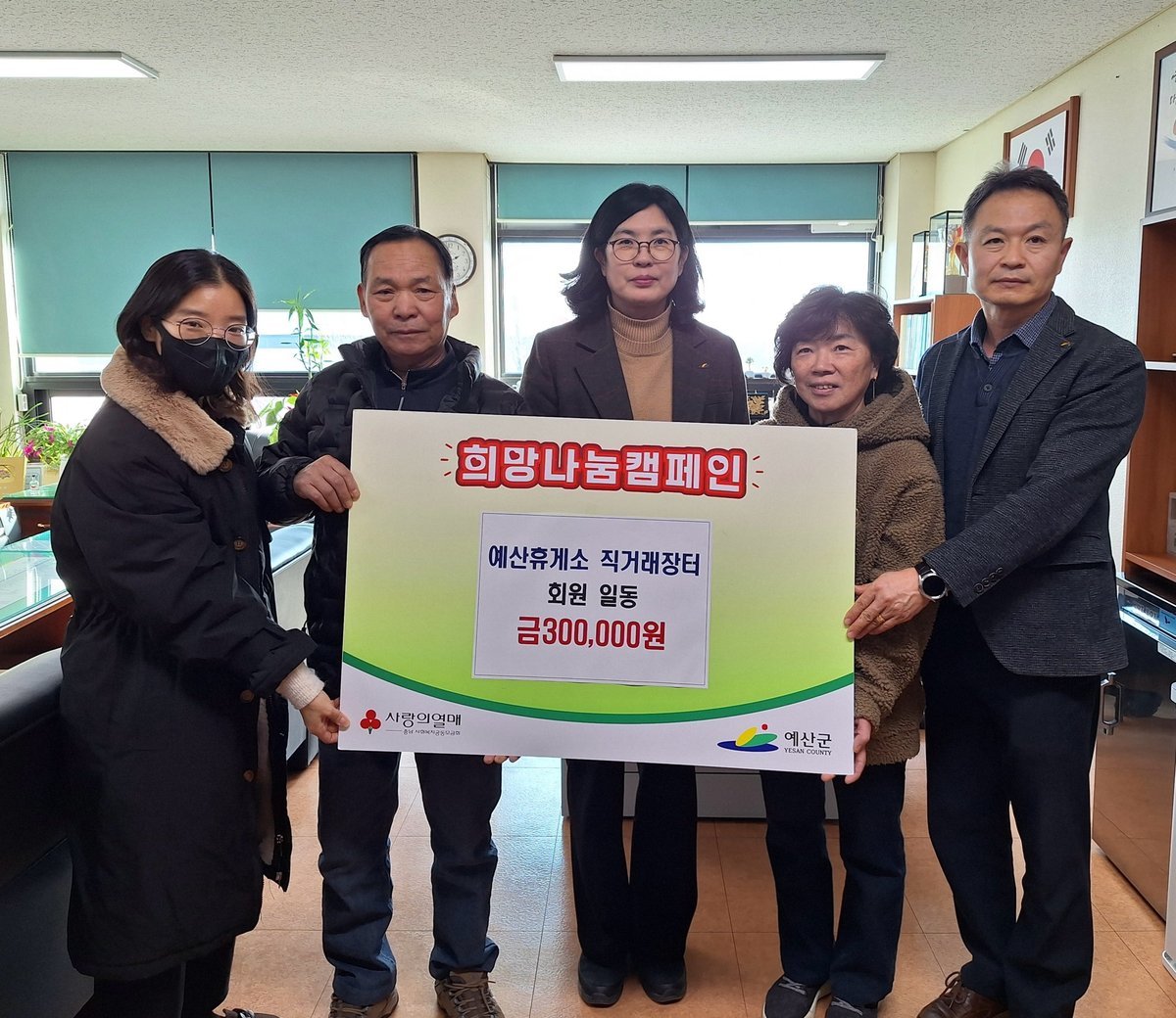 [충청뉴스큐] 예산군은 예산휴게소 직거래장터 대신회 회원들이 지역사회 소외된 이웃을 돕기 위해 예산군에 '희망 2026 나눔 캠페인'성금 30만원을 기탁하며 따뜻한 나눔을 실천했다고 16일 밝혔다.