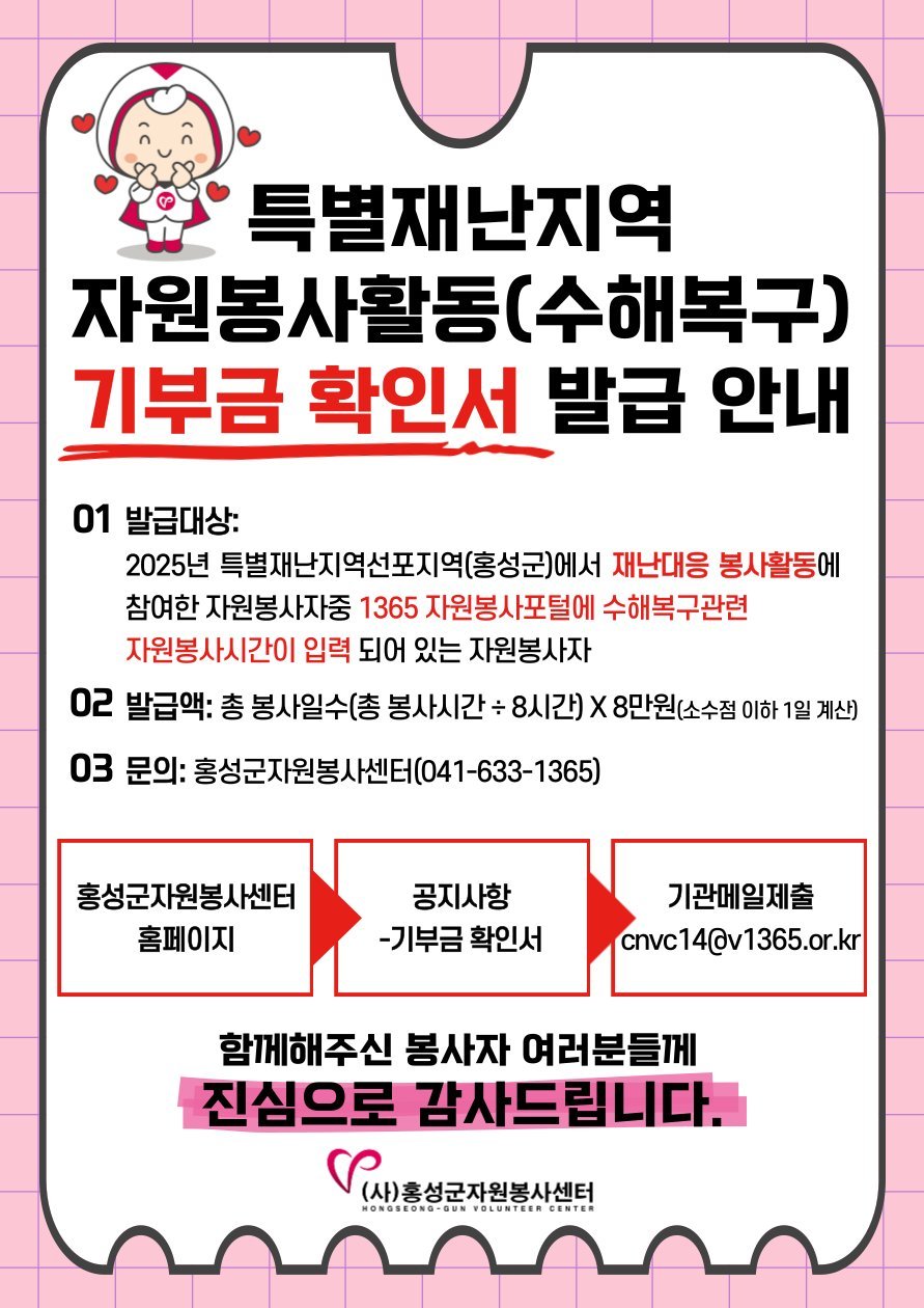 한편 기부금 확인서 발급과 관련한 자세한 사항은 홍성군자원봉사센터로 문의하면 된다.