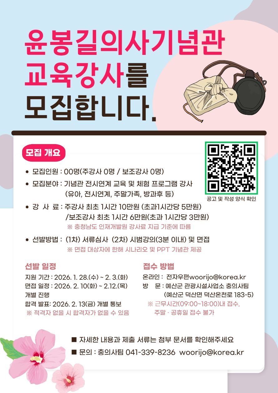 [충청뉴스큐] 예산군 관광시설사업소는 2026년 윤봉길의사기념관 교육 프로그램을 함께 운영할 교육 강사를 공개 모집한다.