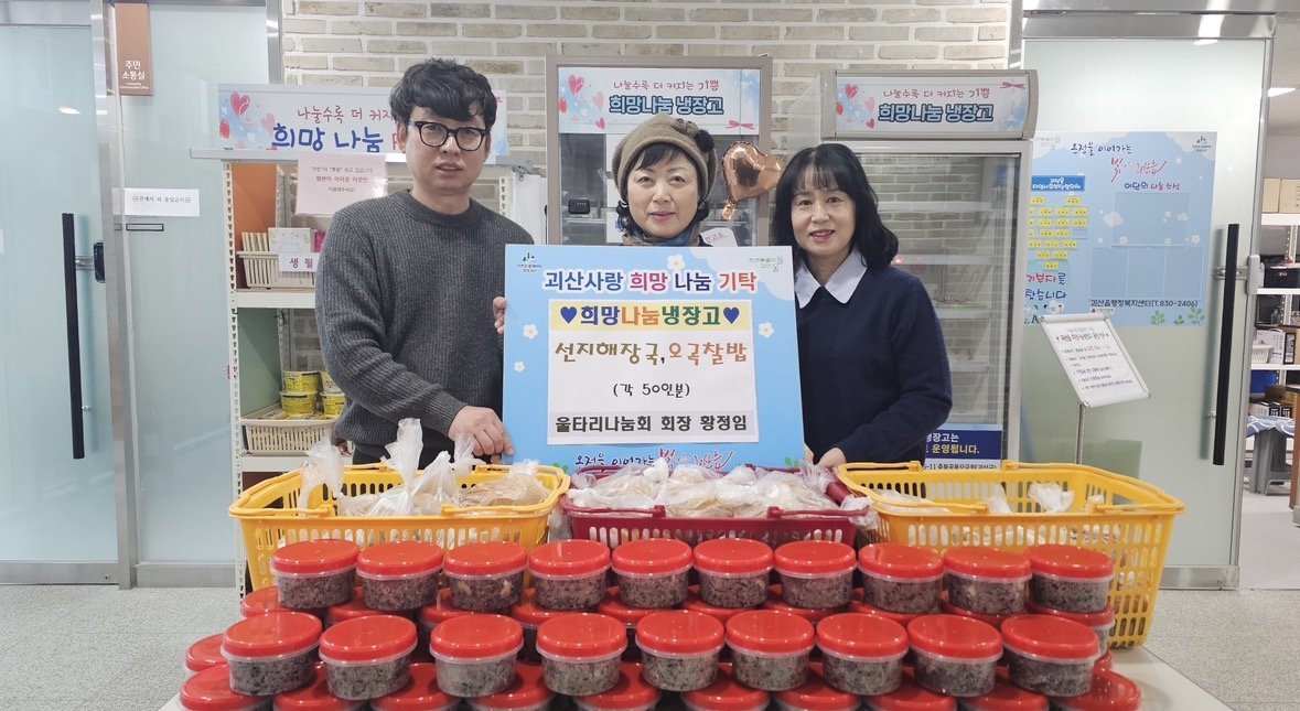 [충청뉴스큐] 충북 괴산군 괴산읍은 울타리나눔회가 20일 괴산읍 행정복지센터를 찾아 저소득층을 위해 사용해 달라며 직접 준비한 선짓국과 오곡찰밥 각 50인분을 기탁했다고 밝혔다.
