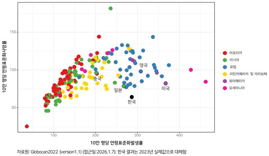 세계표준인구*로 보정한 우리나라 2023년 암 발생률은 인구 10만 명당 288.6명으로 주요국과 유사한 높은 암 발생 수준을 보였다. 반면, 암 사망률은 인구 10만 명당 64.3명으로 일본, 미국 등 주요국 중 현저히 낮았다. 높은 발생률 대비 최저 수준의 사망률은 암을 조기에 발견하고 치료 성과를 지속적으로 높여온 결과로, 우리나라 국가암관리사업의 효과와 역량이 세계적인 수준임을 보여주는 성과로 평가된다.