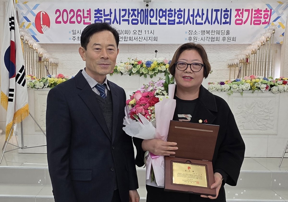 [충청뉴스큐] 서산시의회 가선숙 의원이 1월 20일 열린 '2026년 충남시각장애인연합회 서산시지회 정기총회'에서 공로패를 받았다.