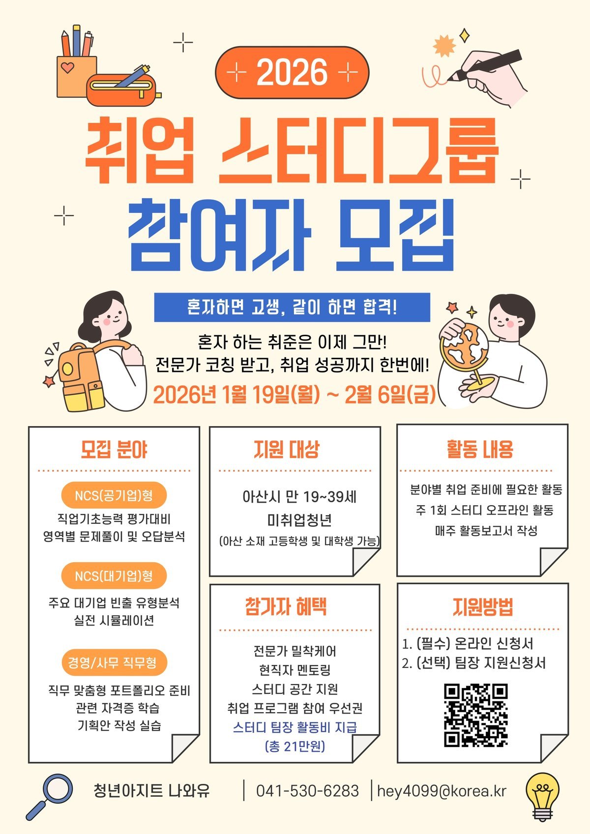 [충청뉴스큐] 아산시는 취업을 준비하는 청년들의 역량 강화를 지원하고 공통의 목표를 가진 청년 간 정보 공유를 활성화하기 위해 ‘2026년 청년 취업스터디그룹 지원사업’참여자를 모집한다고 밝혔다.
