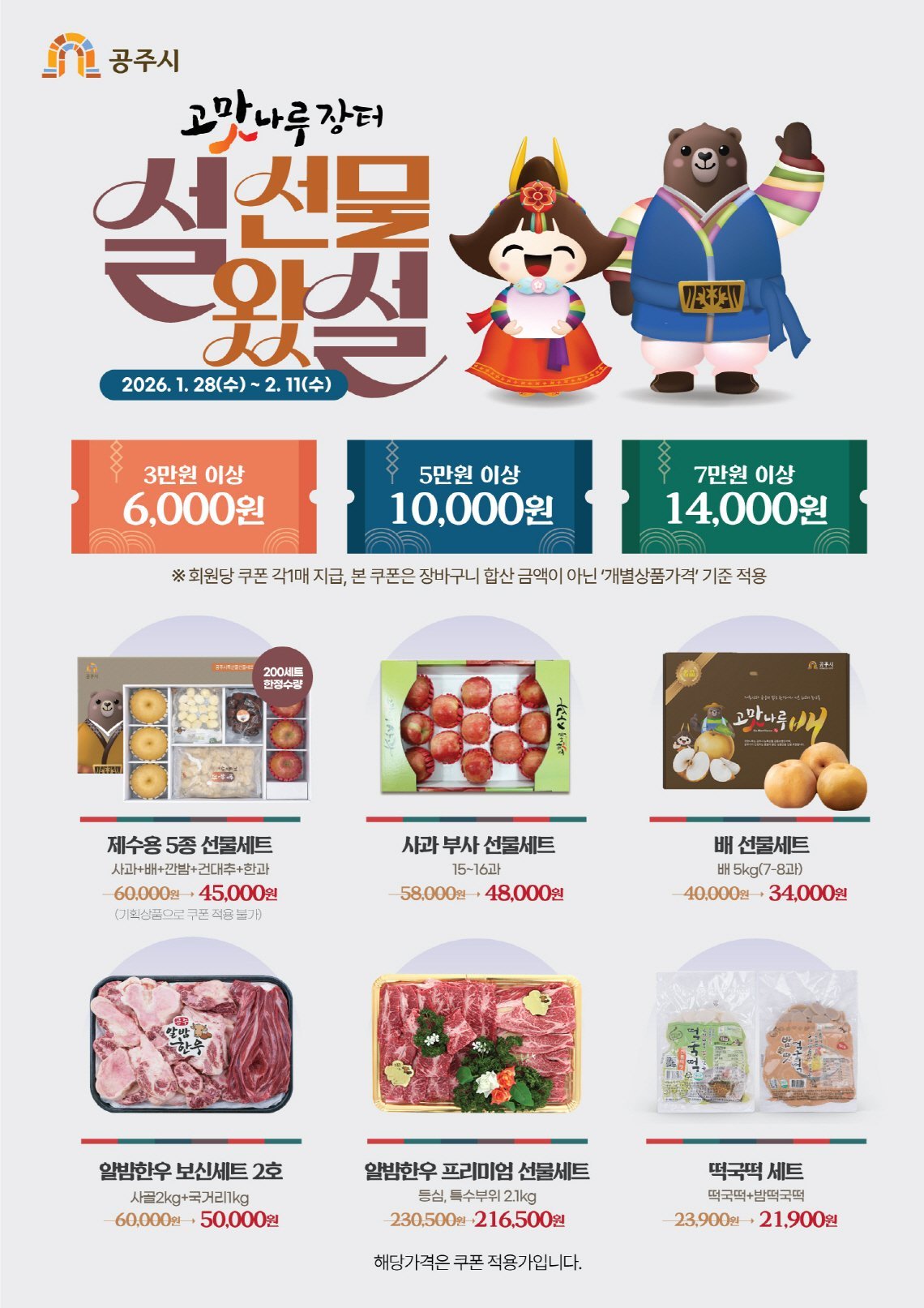 [충청뉴스큐] 공주시가 직접 운영하는 농·특산물 온라인 판매 쇼핑몰 ‘고맛나루장터’는 설 명절을 맞아 1월 28일부터 2월 11일까지 15일간 특별 할인 기획전을 실시한다.
