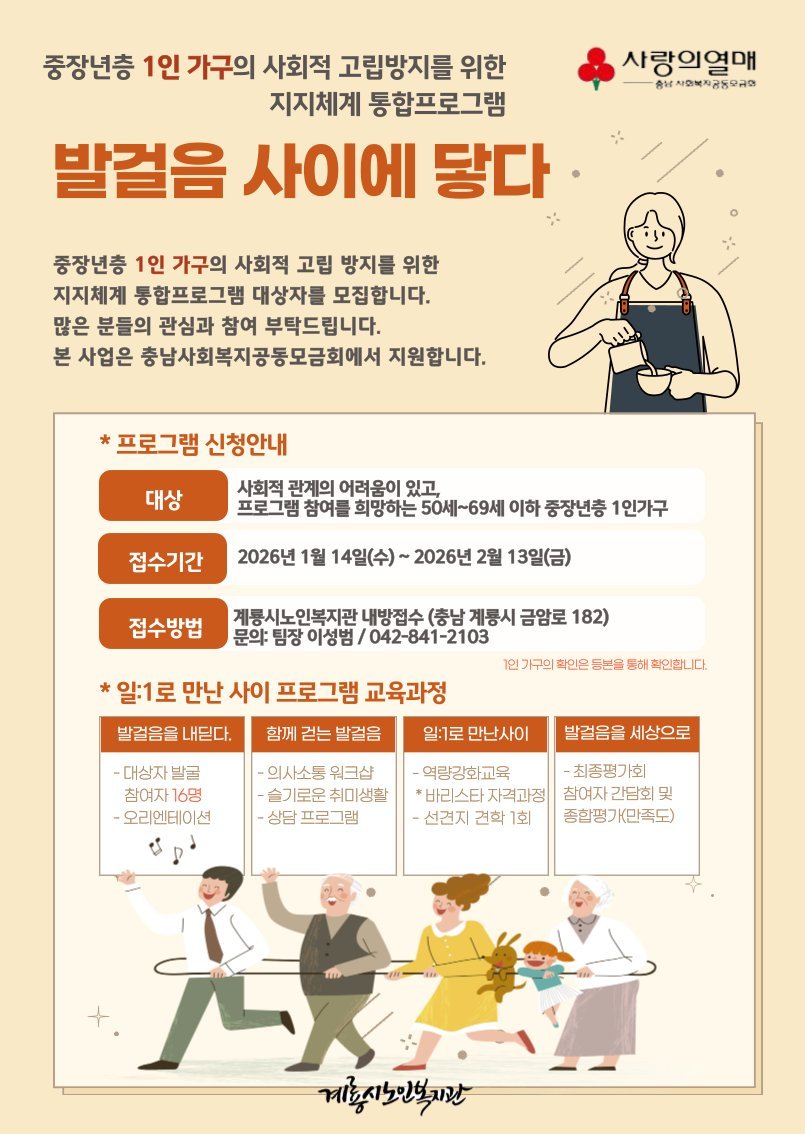 계룡시 관계자는 “이번 프로그램은 중장년층 1인 가구의 사회적 고립을 사전에 예방하고 지역사회와의 연결을 돕기 위한 참여형 복지사업”이라며 “관심 있는 시민들의 적극적인 참여를 바란다”고 말했다.