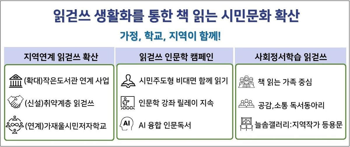 또한 생애주기별 맞춤 교육으로 ‘책 읽는 가족’문화 확산, 교과 연계 프로그램 강화, 독서·사유·실천을 잇는 인문학 캠페인을 중점 추진해 지역과 연계한 ‘읽걷쓰’실천을 추진할 계획이다.