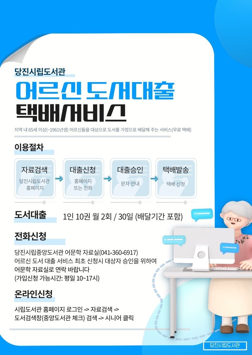 [충청뉴스큐] 당진시는 도서관 방문이 어려운 시민들을 위해 당진시립도서관에서 ‘맘편한 도서관 서비스’와 ‘어르신 도서 대출 택배 서비스’를 운영하고 있다고 27일 밝혔다.