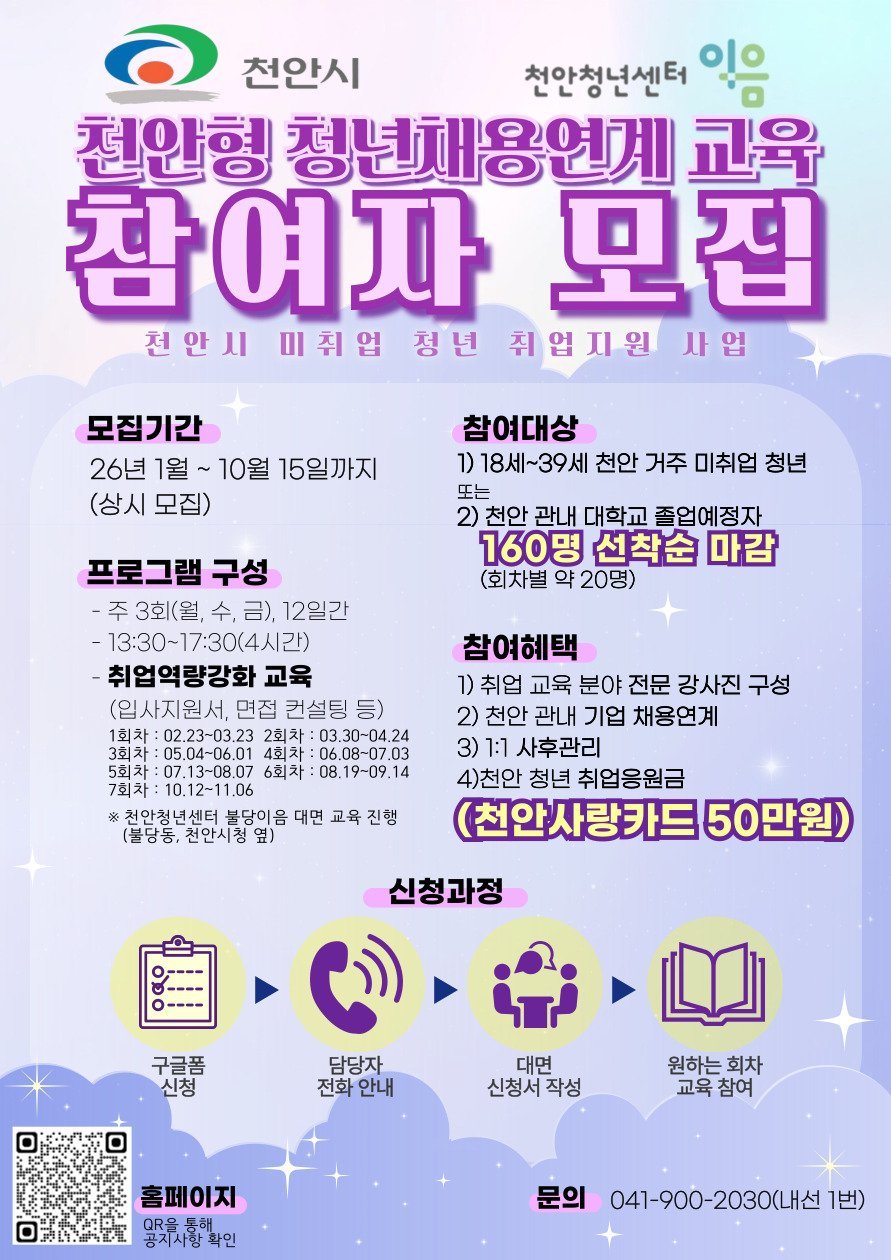 [충청뉴스큐] 천안시는 ‘2026년 천안형 청년 채용연계 프로그램’ 참여자 160명을 선착순 모집한다고 27일 밝혔다.