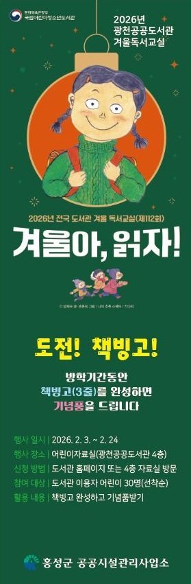[충청뉴스큐] 홍성군 광천도서관에서는 다음달 3일부터 24일까지 어린이 이용자들을 대상으로 한 ‘겨울방학 독서교실’을 운영한다고 밝혔다.