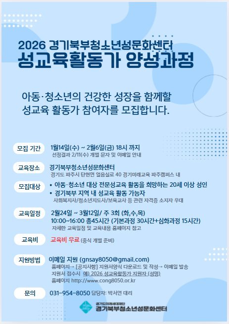 [충청뉴스큐] 경기북부청소년성문화센터가 오는 2월 6일까지 청소년 성교육 활동가 양성과정에 참여할 지원자를 모집한다.