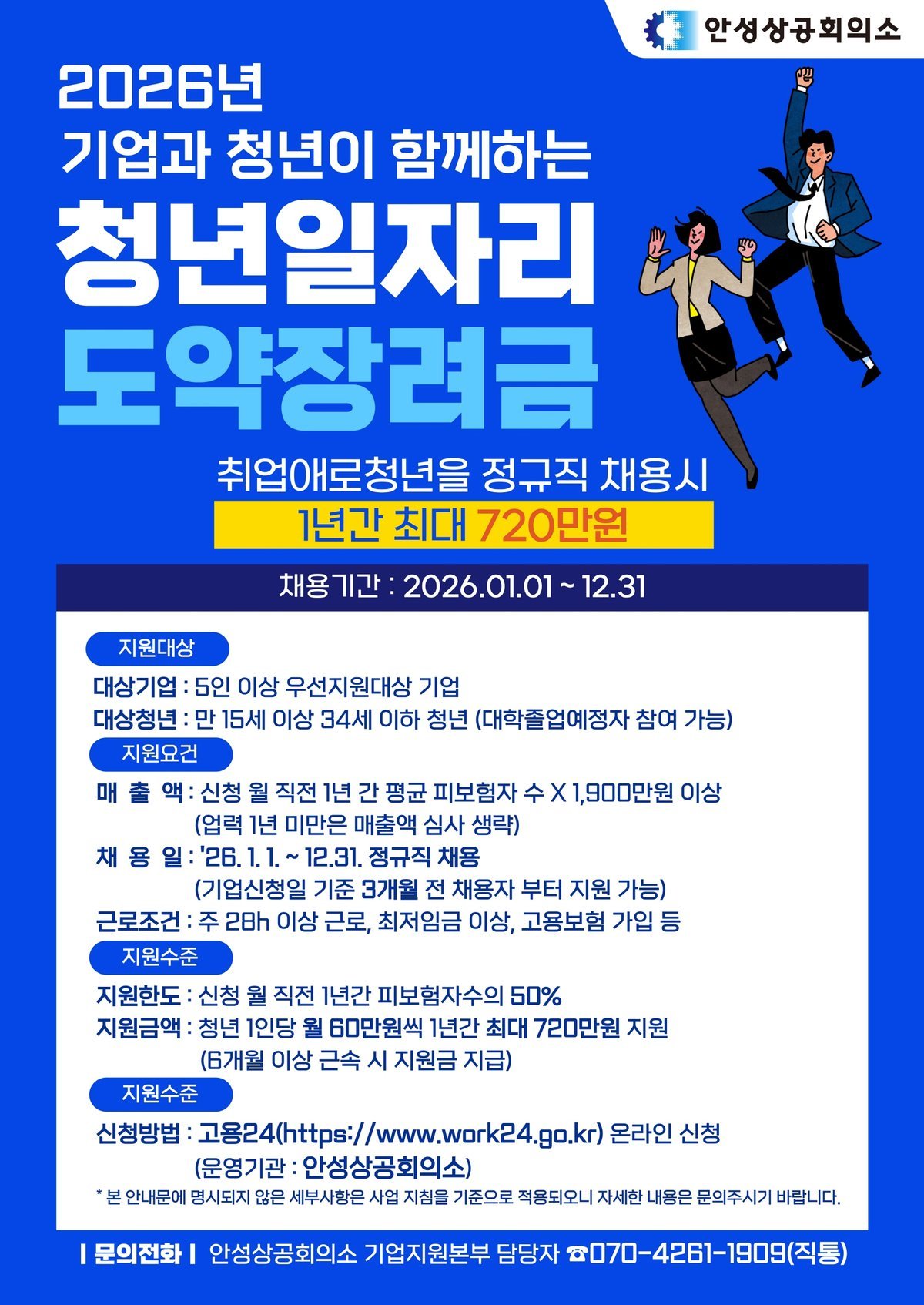 [충청뉴스큐] 안성상공회의소는 최근 고용노동부로부터 ‘2026년 청년일자리 도약장려금’사업운영기관으로 선정됨에 따라 지원대상 사업주와 청년 근로자를 모집한다.