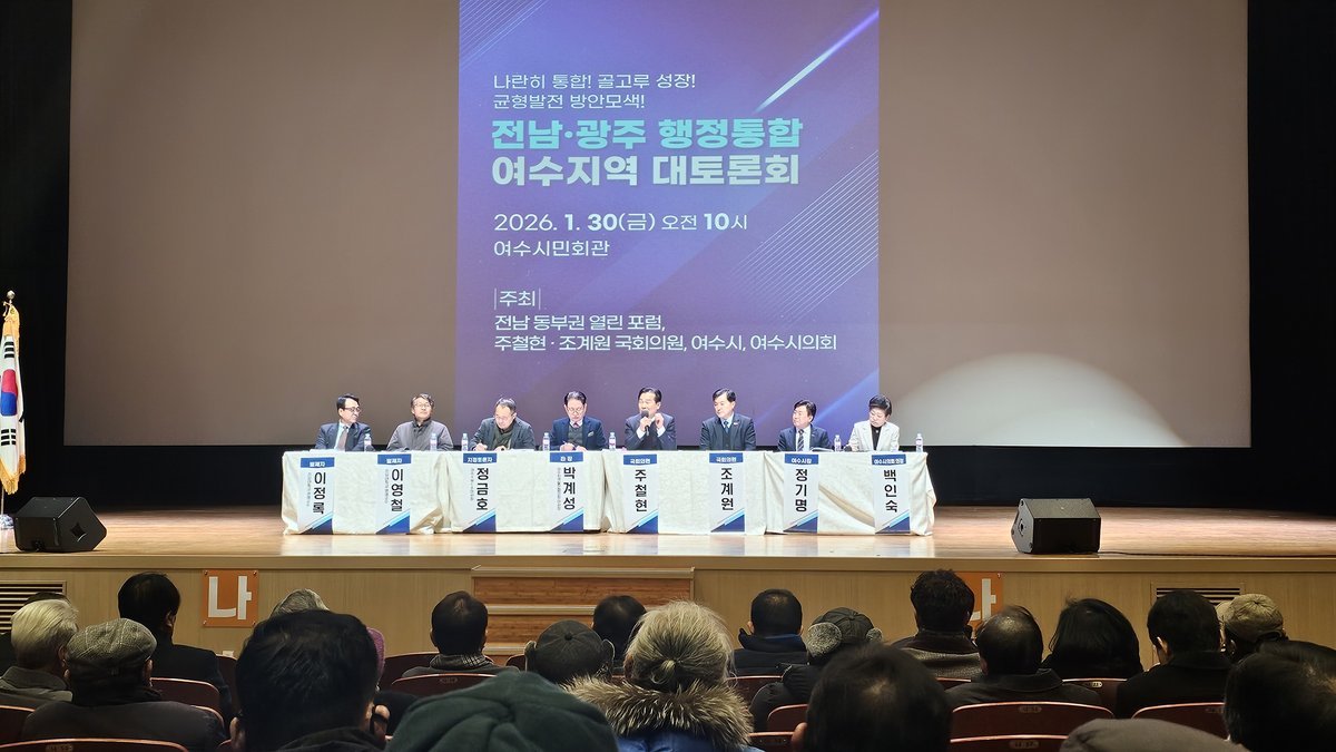 [충청뉴스큐] 주철현·조계원 국회의원은 여수시, 여수시의회, 전남동부권 열린포럼과 함께 '전남·광주 행정통합 여수지역 대토론회'를 30일 여수시민회관에서 공동 개최하고 전남 동부권의 주요 현안과 행정통합 방향을 놓고 시민 의견을 수렴했다.