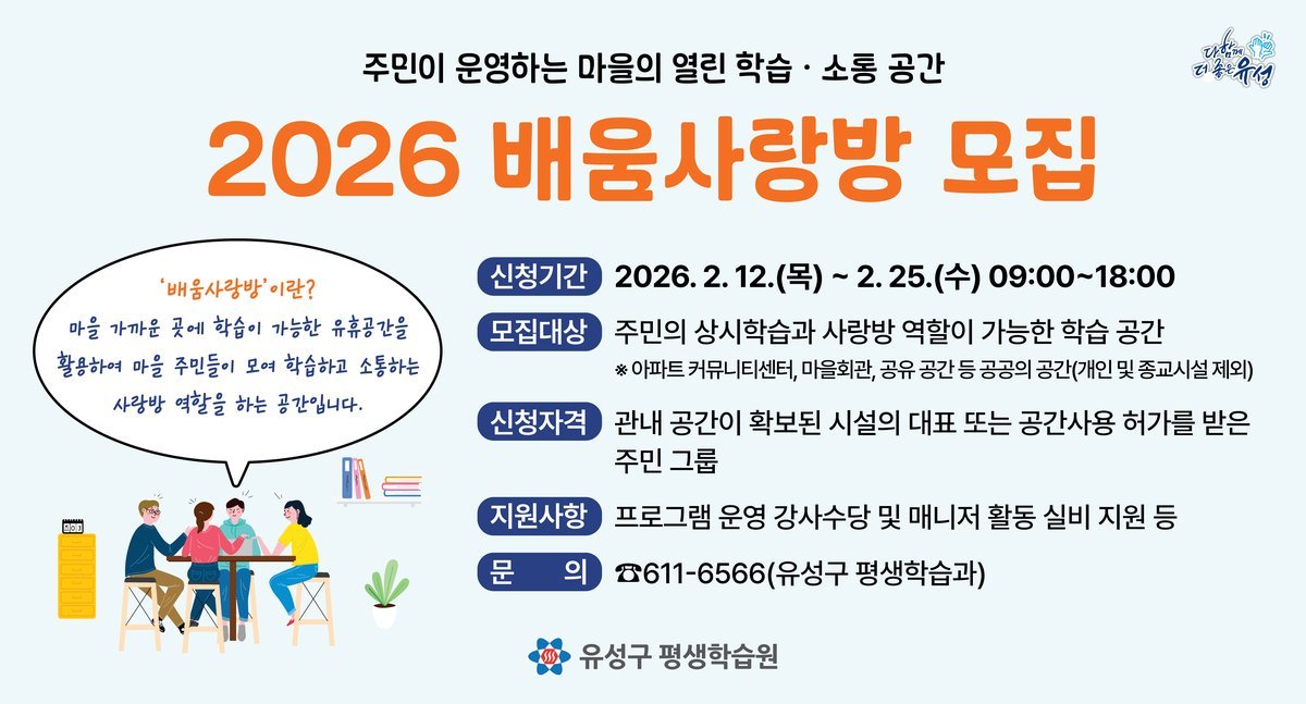 정용래 유성구청장은 "배움사랑방은 주민이 주체로 배우고 소통하는 생활 속 학습 공간"이라며 "배움사랑방이 지역 맞춤형 평생학습 거점으로 자리 잡을 수 있도록 지원하겠다"고 말했다.