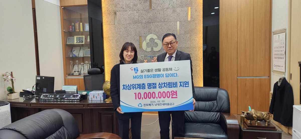 김은정 동장은 "설 명절을 앞두고 어려운 이웃들을 위해 명절차림비를 지원해 주신 남대전새마을금고에 깊이 감사드린다"며 "기탁된 성금은 꼭 필요한 가정에 소중히 전달해 따뜻한 설 명절이 될 수 있도록 하겠다"고 답했다.