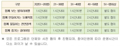 연중 운영하는 이번 체험프로그램은 천체관측활동, 돔 영상물 관람, 가상별자리 체험 등 천문우주과학을 재미있게 알아보는 ‘함께 보는 별자리여행’, 흙을 이용해 머그컵, 접시, 도자기 등 다양한 작품을 만들어보는 ‘함께 만들어가는 도예작품’, 천연염료를 이용해 별모양, 동그라미, 물결무늬 등 다양한 모양의 무늬를 손수건에 물들여보는 ‘함께 물들이는 천연염색’, 안전장비를 착용하고 15m 높이의 인공암벽 등반에 도전해 보는 ‘함께 즐기는 클라이밍’으로 단체가 즐겁게 체험하며 배울 수 있는 프로그램들로 구성되어 있다.