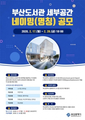 시는 지난 2016년 부산시민 대상 선호도 조사로 도서관의 이름을 ‘부산도서관’으로 확정했고 이번에 공모하는 세부공간은 시민이 이용하는 실내 공간으로 회의공간, 문화공연과 작가 강연회 등을 개최할 소극장, 어린이실, 문학자료 등이 있는 자료실Ⅰ, 동아리실, 일반자료, 국외도서가 소장될 자료실 Ⅱ, 부산학자료실, 강좌실, 옥상정원 등 총 9개 공간이 대상이다.