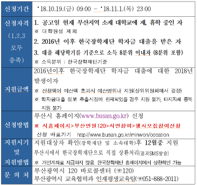 [충청뉴스큐] 부산시는 오는 19일부터 11월 1일까지 2018년도 대학생 학자금 대출이자 지원 신청을 받는다고 밝혔다.