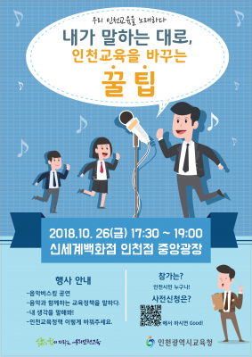 [충청뉴스큐] 인천광역시교육청은 오는 26일 신세계백화점 인천점 중앙광장에서 ‘내가 말하는 대로, 인천교육을 바꾸는 꿀팁’을 실시한다고 밝혔다.
