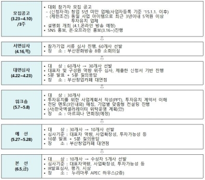 대회 참가 신청은 4월 10일까지 부산경제진흥원 창업지원센터 홈페이지를 통해 온라인으로 접수하며 4월 서면심사와 5월 대면심사 및 예선대회를 통해 최종 선정된 10개사가 6월 5일 해운대 누리마루에서 열리는 본선에 진출하게 된다.