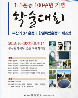 [충청뉴스큐] 부산시는 2019년의 3.1운동 100주년을 기념하여 오는 30일 오후 1시 시청 12층 국제회의장에서 "부산의 3·1운동과 항일독립운동의 재조명" 학술대회를 개최한다고 밝혔다.