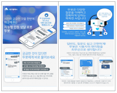 대구시는 4차 산업혁명 시대에 차별화되고 편리한 민원 서비스 제공을 위해, 2017년 행정안전부 첨단정보기술 활용 공공서비스 지원 사업에 선정되어 국비 11억 원을 지원받아 ‘뚜봇’ 시스템 구축을 완료하였으며, 지난 7월 1일부터 정상 서비스 중이다.