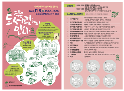 올해로 4회차를 맞는 이번 행사는 책과 관련된 다양한 체험부스를 운영하고, ‘함께 읽는 작은도서관 추천 책’, ‘대구 올해의 책’ 전시, 작가초청 강연회, 샌드아트 및 동극 등 다양한 행사로 이루어져 있다.