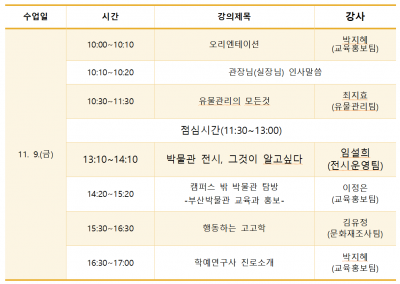 강사로 나서는 학예연구사들은 본인들의 실무경험을 바탕으로 강의를 진행하며, 유물관리팀 수업시간에는 박물관 수장고 견학도 예정되어 있다.
