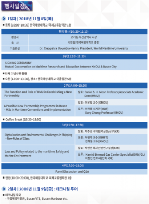 8일에는 클레오파트라 총장의 기조연설을 시작으로 세계해사대학과의 새로운 파트너십 구축을 위하여 부산시와 한국해양대학교 간 공동 선언문을 채택한다.